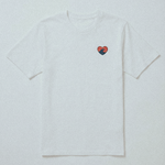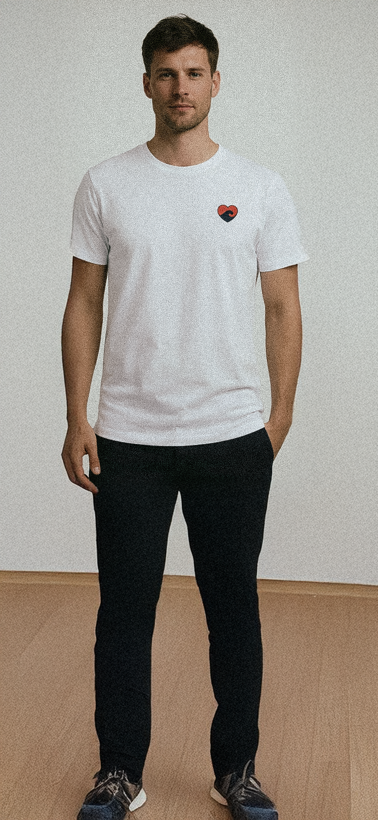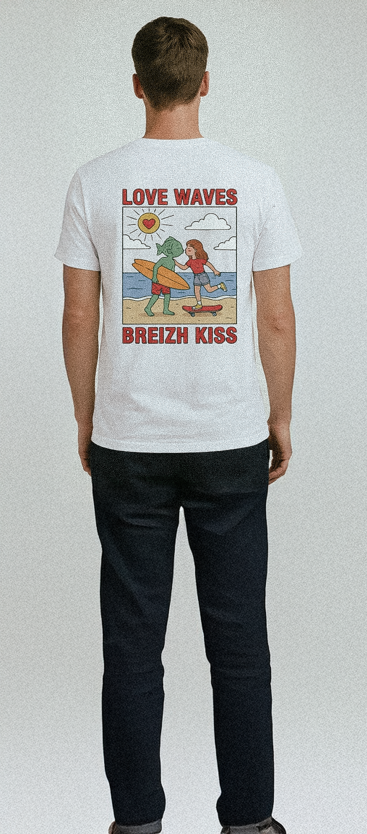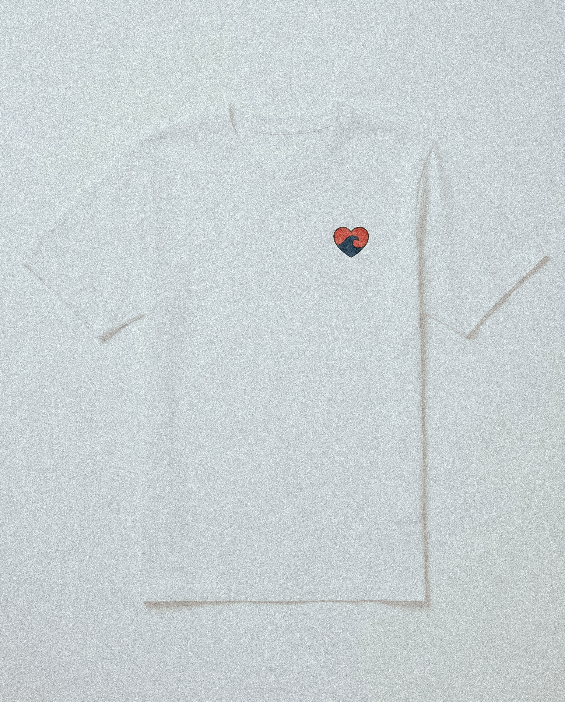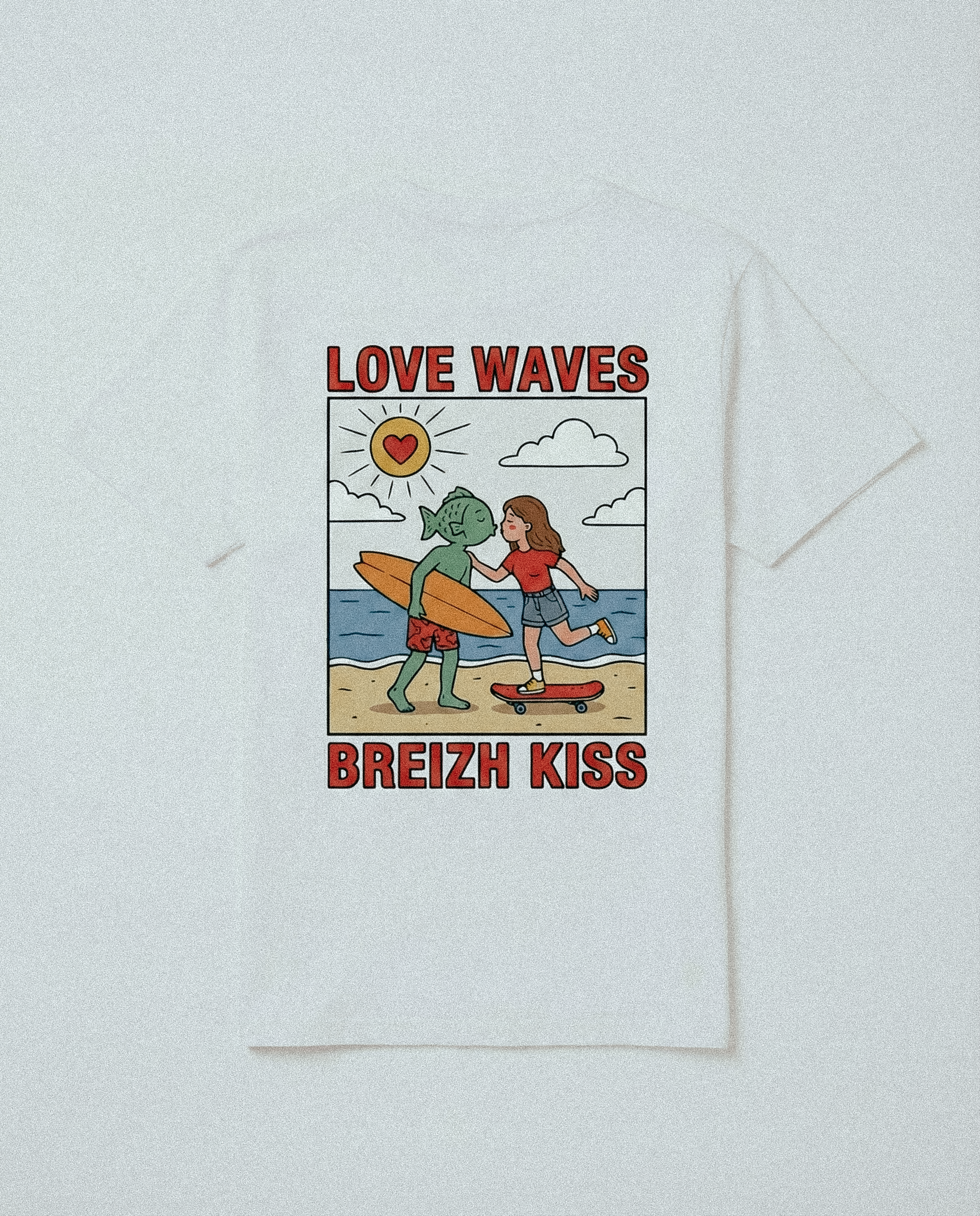 Disponible en blanc ou crème, avec un cœur “vague” discret à l’avant et un visuel fort dans le dos.